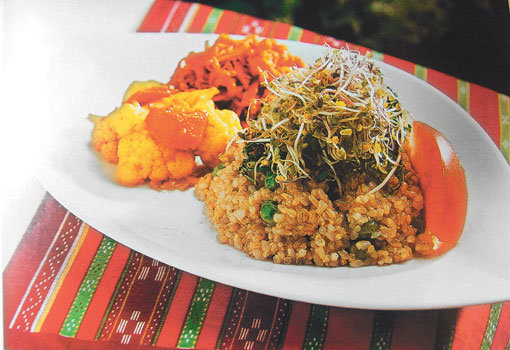 2. 현미가 부드러워지면 30-40분 정도 체에 밭쳐 식힌 뒤 현미밥에 레드와인 식초, 올리브오일, 소금, 후추 가루를 넣고 버무린다. 완두와 먹기 좋게 썰어놓은 토마토를 넣고 살짝 섞어 그릇에 담는다. 쪽파, 무순, 깻잎, 새싹 채소 등 각종 허브를 얹어 곁들인다.