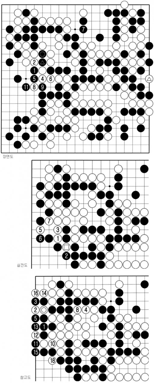 ▽참고도=흑이 1로 잇고 버티면 어떻게 될까. 이때는 백 2로 내려서는 수가 있다. 복잡해 보이지만 흑 돌을 조여 붙이는 수순이 통쾌하다. 이어 백 18로 끊으면 흑에게 대책이 없다. 지난 기 국수였던 윤 7단은 목 9단의 강펀치에 걸려 1회전 탈락하는 아픔을 맛봐야 했다.(6·9…◎, 7…2, 17…12)