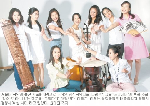 까르르 쏟아지는 웃음소리. 카메라 앞에서 다섯 손가락을 쫙 펴고 인사를 하는 모양새가 여느 아이돌 댄스그룹 못지않다. 스무 살에서 스물다섯 살까지 여성 아홉 명으로 구성된 창작국악그룹 ‘나리랑((나,라)利琅)’의 상큼한 에너지가 스튜디오에 넘쳐난다.