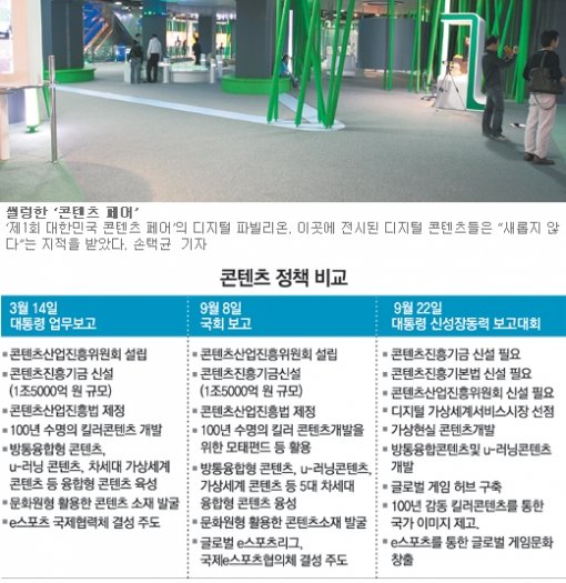 그러나 추진위 보고 내용은 문화부가 이미 국회에 보고한 콘텐츠 정책과 거의 다를 바 없다. 문화부는 지난달 8일 국회에 ‘콘텐츠 산업의 전략적 육성’이라는 제목 아래 △100년 수명의 킬러 콘텐츠 개발을 위해 모태펀드 등 활용 △방통융합형 콘텐츠, u-러닝 콘텐츠, 가상세계 콘텐츠 등 5대 차세대 융합형 콘텐츠 육성 △문화 원형을 활용한 콘텐츠 소재 발굴 △글로벌 e스포츠리그 결성 등을 주요 정책으로 보고했다. 3월 장관의 대통령 업무보고 당시 나온 내용과도 크게 다르지 않아 콘텐츠 정책과 관련해 구체적인 성과 없이 유사한 내용만 되풀이하고 있다는 지적이 나오고 있다.