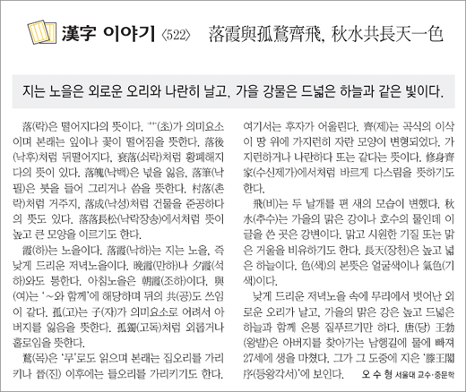 霞(하)는 노을이다. 落霞(낙하)는 지는 노을, 즉 낮게 드리운 저녁노을이다. 晩霞(만하)나 夕霞(석하)와도 통한다. 아침노을은 朝霞(조하)이다. 與(여)는 ‘∼와 함께’에 해당하며 뒤의 共(공)도 쓰임이 같다. 孤(고)는 子(자)가 의미요소로 어려서 아버지를 잃음을 뜻한다. 孤獨(고독)처럼 외롭거나 홀로임을 뜻한다.