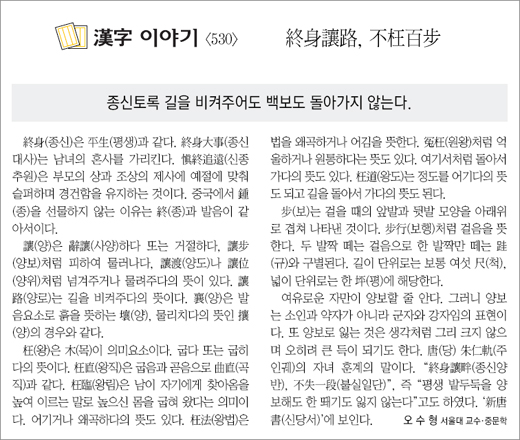 여유로운 자만이 양보할 줄 안다. 그러니 양보는 소인과 약자가 아니라 군자와 강자임의 표현이다. 또 양보로 잃는 것은 생각처럼 그리 크지 않으며 오히려 큰 득이 되기도 한다. 唐(당) 朱仁軌(주인궤)의 자녀 훈계의 말이다. “終身讓畔(종신양반), 不失一段(불실일단)”, 즉 “평생 밭두둑을 양보해도 한 뙈기도 잃지 않는다”고도 하였다. ‘新唐書(신당서)’에 보인다.