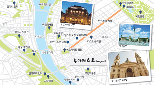 독일 남부에서 시작돼 9개 나라, 2850km를 달린다는 다뉴브 강은 부다페스트의 가운데를 가로지르며 유유히 흐른다. 이 강을 기준으로 왼쪽이 부다, 오른쪽이 페스트 지역이다. 예부터 얕은 구릉지형인 부다에는 왕족이나 귀족이, 지평선이 보일 만큼 광활한 평지인 페스트에는 서민들이 살았다.