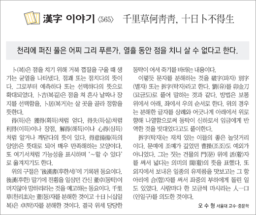 위의 구절은 ‘後漢書(후한서)’에 기록된 동요이다. 後漢(후한) 말기에 전횡을 일삼던 간신 董卓(동탁)이 머지않아 망하리라는 것을 예고하는 동요이다. 千里草(천리초)는 董(동)자를 분해한 것이고 十日卜(십일복)은 卓(탁)자를 분해한 것이다. 결국 위세 당당한 동탁이 어서 죽기를 바라는 내용이다.