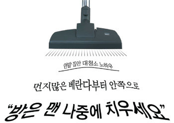 상당수 주부는 청소를 할 때 방부터 치우기 시작한다. 그러나 청소는 베란다를 먼저 끝낸 후 거실을 하고 이어 방을 치우는 순서로 하는 것이 효과적이다. 청소는 집 바깥쪽부터 해야 먼지가 안쪽으로 들어오는 것을 막을 수 있다.