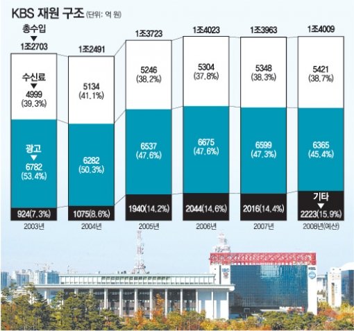 ▽공영방송 재원=공영방송법 초안은 수신료와 광고의 비중을 8 대 2로 맞추는 것을 목표로 하고 있다. KBS 재원 중 광고 비중은 47.3%, 수신료 비중은 38.3%(2007년 기준)로 공영방송이라고 보기 어려울 정도로 광고 의존도가 높다. BBC 지상파 방송의 수신료 비중은 99%, 일본 NHK는 97%가 넘는다. 감사원도 2004년 KBS 감사 당시 수신료 비중을 높이기 위해 수신료 인상이 불가피하다고 지적했다.