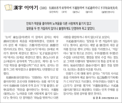 안회가 仁에 대해 묻자 공자는 “자기의 사사로움을 극복하여 예로 돌아가는 克己復禮(극기복례)가 仁이다”라고 가르쳤다. 주자(주희)는 안회가 克己(극기) 공부를 했기에 ‘不遷怒(불천노) 不貳過(불이과)’했다고 해설했다. 안회는 인격 주체를 성장시키는 참된 공부를 했던 것이다.