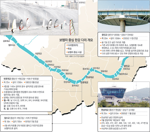 프랑스 파리 센 강을 가로지르는 퐁뇌프에서는 연인들이 만나 사랑을 나눈다. 우리나라 한강을 가로지르는 원효대교에는 괴물이 산다. 프랑스 영화 ‘퐁뇌프의 연인들’과 우리 영화 ‘괴물’의 이야기다. 다리를 배경으로 풀어내는 두 영화는 센 강의 다리와 한강의 다리를 느끼는 정서적 차이를 극명하게 드러낸다. 센 강의 퐁뇌프에는 낭만이 흐르지만, 한강의 다리에서는 살풍경이 연출된다. 사람들로 북적이는 퐁뇌프와, 접근조차 쉽지 않은 한강 교량의 태생적 한계 때문이다. 그런데 요즘 한강 다리도 달라지고 있다. 차 중심의 다리가 보행자 중심의 다리로 모습을 바꾸고 있다. 차 한 잔의 여유도 누릴 수 있게 됐고, 풀냄새를 맡으며 쉬어갈 수도 있게 됐다. 한강 다리에 다가가 쉼표를 찍어 보자.