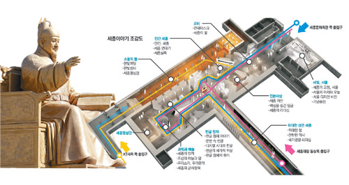 세종대왕은 온화한 미소를 띠고 오른팔을 벌린 채 왼손에는 훈민정음 해례본을 들었다. 동상 앞에는 해시계, 측우기, 혼천의 등을 본떠 만든 조형물을 설치했고, 뒤편으로는 세종대왕의 업적을 부조로 새긴 열주(列柱·기둥) 6개를 세웠다. 옛 광화문 지하차도를 리모델링한 ‘세종이야기’도 함께 공개했다. 전시관 여섯 곳을 갖춘 세종이야기에서는 세종대왕의 업적과 일대기를 담은 전시물을 감상할 수 있다.
