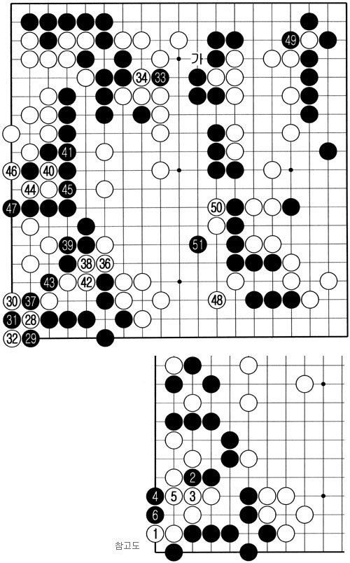 급소를 찔린 좌하 귀 백 말의 사활은 어떻게 될까. 백 30은 이상한 모양이지만 패를 낼 수 있는 유일한 활로. 참고도 백 1로 궁도를 넓혀 봐도 흑 2, 4의 연타로 꼼짝없이 잡힌다.