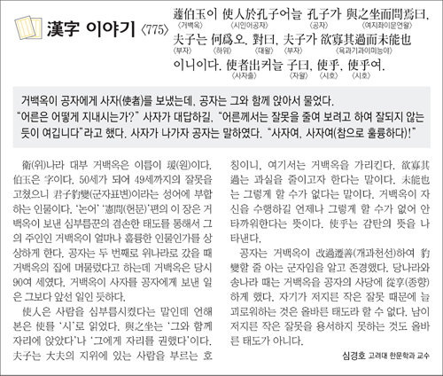 衛(위)나라 대부 거백옥은 이름이 瑗(원)이다. 伯玉은 字이다. 50세가 되어 49세까지의 잘못을 고쳤으니 君子豹變(군자표변)이라는 성어에 부합하는 인물이다. ‘논어’ ‘憲問(헌문)’편의 이 장은 거백옥이 보낸 심부름꾼의 겸손한 태도를 통해서 그의 주인인 거백옥이 얼마나 훌륭한 인물인가를 상상하게 한다. 공자는 두 번째로 위나라로 갔을 때 거백옥의 집에 머물렀다고 하는데 거백옥은 당시 90여 세였다. 거백옥이 사자를 공자에게 보낸 일은 그보다 앞선 일인 듯하다.