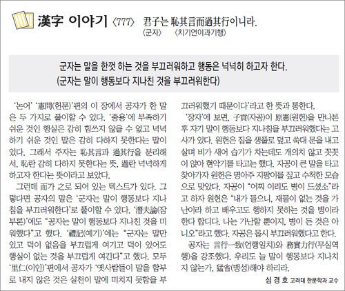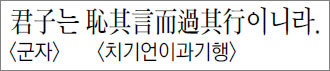 그런데 而가 之로 되어 있는 텍스트가 있다. 그렇다면 공자의 말은 ‘군자는 말이 행동보다 지나침을 부끄러워한다’로 풀이할 수 있다. ‘潛夫論(잠부론)’에도 “공자는 말이 행동보다 지나친 것을 미워했다”고 했다. ‘禮記(예기)’에는 “군자는 말만 있고 덕이 없음을 부끄럽게 여기고 덕이 있어도 행실이 없는 것을 부끄럽게 여긴다”고 했다. 모두 ‘里仁(이인)’편에서 공자가 ‘옛사람들이 말을 함부로 내지 않은 것은 실천이 말에 미치지 못함을 부끄러워했기 때문이다’라고 한 뜻과 통한다.