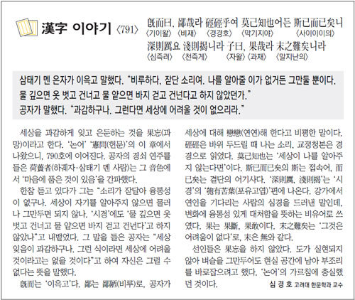 세상을 과감하게 잊고 은둔하는 것을 果忘(과망)이라고 한다. ‘논어’ ‘憲問(헌문)’의 이 章에서 나왔으니, 790호에 이어진다. 공자의 경쇠 연주를 들은 荷(괴,궤)者(하궤자·삼태기 멘 사람)는 그 音色에서 ‘마음에 품은 것이 있음’을 간파했다.