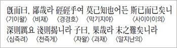 旣而는 ‘이윽고’다. 鄙는 鄙陋(비루)로, 공자가 세상에 대해 戀戀(연연)해 한다고 비평한 말이다. 갱갱은 바위 두드릴 때 나는 소리, 교정청본은 경경으로 읽었다. 莫己知也는 ‘세상이 나를 알아주지 않는다면’이다. 斯已而已矣의 斯는 접속어, 而已矣는 결단의 어기사다. ‘深則(려,여), 淺則揭’는 ‘시경’의 ‘匏有苦葉(포유고엽)’편에 나온다. 강가에서 연인을 기다리는 사람의 심경을 드러낸 말인데, 변화에 융통성 있게 대처함을 뜻하는 비유어로 쓰였다. 果는 果斷, 果敢이다. 末之難矣는 ‘그것은 어려움이 없다’로, 末은 無와 같다.