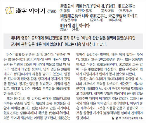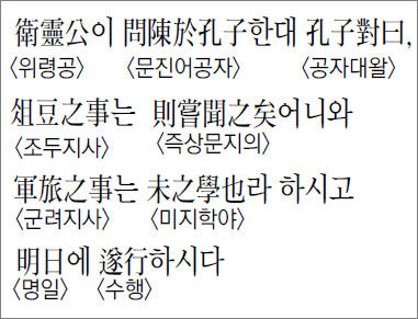 陳은 陣(진)의 옛 글자로 군대가 隊伍(대오)를 이루는 구조를 말한다. 俎豆의 俎는 희생물을 신 앞에 바치는 臺(대), 豆는 나무로 만든 제기이다. 俎豆之事는 祭禮(제례)나 禮法를 代喩(대유)한다. 則은 주어에 해당하는 어휘를 강조한다. 嘗聞之는 일찍이 들었다는 말인데, 배운 적이 있다는 뜻이다. 軍旅의 軍은 1만2500명의 병사, 旅는 500명의 병사로 이뤄진 軍團(군단)이다. 未之學의 之는 앞에 나온 軍旅之事를 대신한다. 짧은 부정문의 빈어가 대명사라서 빈어가 동사 앞으로 나왔다.