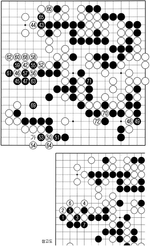 조 9단은 조금씩 초조해진다. 흑에게 두 집 정도 뒤지는데 이를 만회할 곳이 점점 사라져간다. 흑을 괴롭혀 실수를 유도해야 한다. 조 9단은 백 70, 72로 패 모양을 만든다. 패는 요술쟁이라고 믿고서.