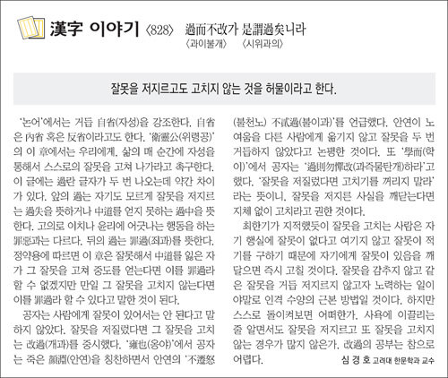공자는 사람에게 잘못이 있어서는 안 된다고 말하지 않았다. 잘못을 저질렀다면 그 잘못을 고치는 改過(개과)를 중시했다. ‘雍也(옹야)’에서 공자는 죽은 顔淵(안연)을 칭찬하면서 안연의 ‘不遷怒(불천노) 不貳過(불이과)’를 언급했다. 안연이 노여움을 다른 사람에게 옮기지 않고 잘못을 두 번 거듭하지 않았다고 논평한 것이다. 또 ‘學而(학이)’에서 공자는 ‘過則勿憚改(과즉물탄개)하라’고 했다. ‘잘못을 저질렀다면 고치기를 꺼리지 말라’라는 뜻이니, 잘못을 저지른 사실을 깨닫는다면 지체 없이 고치라고 권한 것이다.