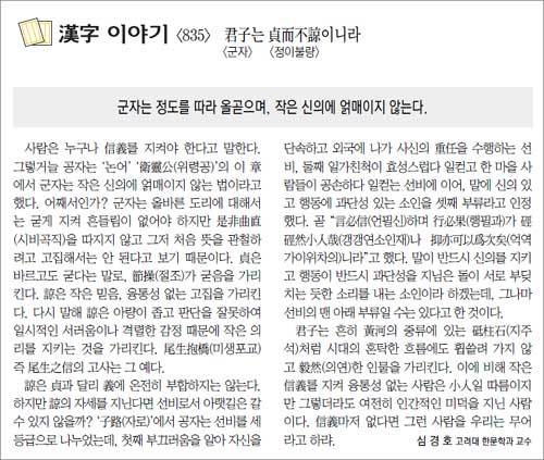 사람은 누구나 信義를 지켜야 한다고 말한다. 그렇거늘 공자는 ‘논어’ ‘衛靈公(위령공)’의 이 章에서 군자는 작은 신의에 얽매이지 않는 법이라고 했다. 어째서인가? 군자는 올바른 도리에 대해서는 굳게 지켜 흔들림이 없어야 하지만 是非曲直(시비곡직)을 따지지 않고 그저 처음 뜻을 관철하려고 고집해서는 안 된다고 보기 때문이다. 貞은 바르고도 굳다는 말로, 節操(절조)가 굳음을 가리킨다. 諒은 작은 믿음, 융통성 없는 고집을 가리킨다. 다시 말해 諒은 아량이 좁고 판단을 잘못하여 일시적인 서러움이나 격렬한 감정 때문에 작은 의리를 지키는 것을 가리킨다. 尾生抱橋(미생포교) 즉 尾生之信의 고사는 그 예다.