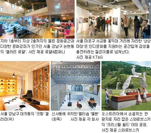 ○ 트렌디한 복합문화공간 확대 한곳에서 휴식과 문화생활을 동시에 즐길 수 있는 공간이 각광을 받으면서 서울 시내 트렌디한 거리를 중심으로 소규모 복합문화공간도 속속 늘고 있다.