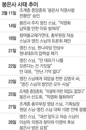 11일 조계종 중앙종회가 봉은사(서울 강남구 삼성동) 직영사찰 전환안을 승인한 뒤 3주째 불교계가 야단법석이다. 14일 봉은사 일요법회에서 봉은사 주지 명진 스님이 반대를 공식화한 이래 명진 스님의 폭로전과 불자단체, 중앙종회 등 종단 주요 단체의 견해 표명이 이어지면서 불자들의 피로감도 높아지고 있다.