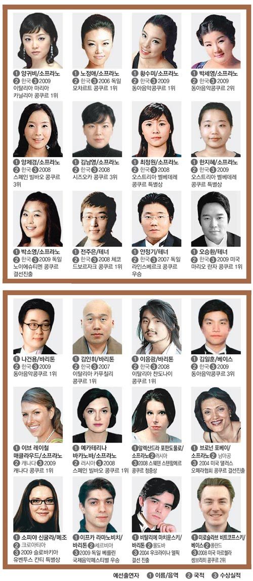 해외 입상 경력으로 볼 때 32명의 한국인 참가자가 돋보인다. 2008년 오스트리아 벨베데레 콩쿠르 특별상을 수상한 최정원 씨, 2009년 프랑스 마르세유 콩쿠르 1위를 수상한 한지혜 씨(이상 소프라노), 2008년 체코 드보르자크 콩쿠르 우승자인 전주은 씨(테너), 2007년 이탈리아 카푸칠리 콩쿠르 우승자인 김인휘 씨(바리톤), 2009년 미국 마리오 란자 콩쿠르 1위를 차지한 오승환 씨(테너) 등이다.