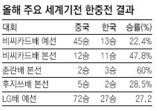 지난달 열린 LG배 예선을 살펴보면 중국에 대한 한국의 열세가 두드러진다. 한국 기사들은 1회전부터 줄줄이 중국 선수들에게 밀렸다. 1∼4차전에 걸쳐 66패를 당한 반면 25승(승률 27.4%)밖에 못 거뒀다. 한국의 승리엔 아마추어 선수들의 3승이 들어 있다.