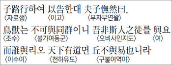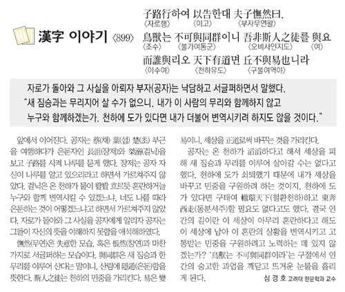 공자는 온 천하가 滔滔하다고 해서 세상을 피해 새 짐승과 무리를 이루어 살아갈 수는 없다고 했다. 천하에 도가 쇠퇴했기 때문에 내가 세상을 바꾸고 민중을 구원하려 하는 것이지, 천하에 도가 있다면 구태여 轍環天下(철환천하)하고 東奔西走(동분서주)할 필요도 없다고도 했다. 결국 인간의 길이란 이 세상이 아무리 혼란하다고 해도 이 세상에 남아 이 혼란의 상황을 변역시키고 고통받는 민중을 구원하려고 노력하는 데 있지 않겠는가? ‘鳥獸는 不可與同群이라’는 구절에서 인간의 숭고한 과업을 깨닫고 뜨거운 눈물을 흘리게 된다.