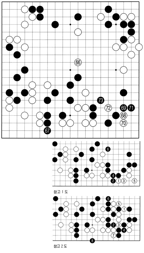 흑 71까진 당연한데 다음 수가 어렵다. 참고도 백 1로 붙여 귀의 삶을 도모하는 것은 하책 중 하책. 귀는 무난히 살겠지만 하변 백은 사경을 헤매게 된다. 이게 다 흑 67의 효과다.