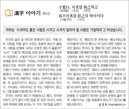 인간의 삶은 늘 타인과 연계되어 있다. 이때 모든 사람을 차별 없이 사귀는 포용적 태도가 옳을까, 사람을 분별해 사귀는 단호한 태도가 옳을까? ‘논어’ ‘子張’의 제3장을 보면 공자 제자들은 의견이 엇갈렸다. 子夏의 門人이 子張에게 벗 사귀는 문제를 묻자 자장은 “자하는 무어라 하더냐”고 되물었으므로 자하의 문인은 위와 같이 대답했다. 子夏曰 이하는 인용문이므로 ‘하더이다’라는 토를 붙였다. 자하는 이름이 商으로 孔門十哲(공문십철) 가운데 한 사람이다. 可者는 사귀어도 좋은 사람, 즉 益友(익우)다. 與之는 그와 사귄다는 뜻이다. 不可者는 사귀어서는 안 되는 사람이다. 拒之는 그를 拒絶(거절)한다는 뜻이다.