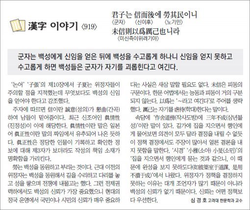 ‘논어’ ‘子張’의 제10장에서 子夏는 위정자들이 주의할 점을 지적했는데 무엇보다도 백성의 신임을 얻어야 한다고 강조했다.