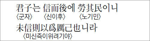 勞는 백성을 동원하고 부리는 것이다. 근대 이전의 위정자는 백성을 동원해서 길을 수리하고 다리를 놓고 성을 쌓으며 전쟁에 내몰고는 했다. 그런 전제권력하에서도 백성의 신뢰가 가장 중요했으니 현대의 정국 운영에서 국민이나 시민의 신뢰가 매우 중요하다는 사실은 새삼 말할 필요도 없다. 未信은 피동의 구문이다. 한문 어법에서는 능동과 피동이 거의 구분되지 않는다. 以爲는 ‘∼라고 여긴다’로 주어를 생략했다. (려,여)己는 자기를 虐待(학대)한다는 말이다.