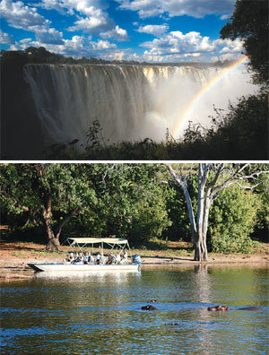 폭 1708m로 세상에서 가장 규모가 큰 빅토리아폭포를 짐바브웨 쪽에서 바라본 모습. 깊이 108m협곡의 폭포가 일으켜낸 물보라로 폭포 동편에 무지개가 걸렸다.(위 사진) 초베 강 리버 사파리에 나선 보트 한 척이 수중에서 먹이활동 중인 하마를 발견하고는 조심스럽게 접근하고 있다. 건기를 맞은 요즘 초베 국립공원은 마르지 않는 물(초베 강)을 찾아 이동해온 코끼리 등 동물들로 그 어느 때보다 활기가 넘친다.(아래 사진) ‘사파리’(영어)의 어원은 ‘여행’을 뜻하는 스와힐리 어(아프리카)의 ‘사피리’. 19세기만 해도 ‘사냥’을 뜻했지만 동물사냥이 금지된 지금은 ‘동물관찰 사바나투어’로 바뀌었다. 대개는 지붕 없는 사륜구동차량이나 트럭짐칸을 좌석으로 개조한 특수차량으로 초원을 누빈다. 하지만 초베 국립공원처럼 강을 낀 곳에서는 해질 녘 보트로 강 안을 크루즈하며 이제 막 먹이 활동을 시작한 동물을 관찰한다. 이런 것을 ‘리버 사파리’라고 한다.