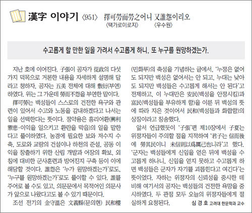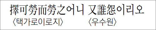 擇可勞는 백성들이 스스로의 건전한 욕구와 관련이 있어서 수고와 노동을 감내하겠다고 나서는 일을 선택한다는 뜻이다. 정약용은 흥리어환(興利禦患·이익을 일으키고 환란을 막음)의 일을 말한다고 풀이하였다. 농경에 필요한 보와 저수지 수축, 도로와 교량의 건설이나 하천의 준설, 공동 이익을 창출하기 위한 산림 개발과 어장의 확보, 외침에 대비한 군사훈련과 방어진지 구축 등이 이에 해당할 것이다. 誰怨은 ‘누가 원망하겠는가’로도, ‘누구를 원망하겠는가’로도 풀이할 수 있다. 誰를 주어로 볼 수도 있고, 의문문에서 목적어인 의문사가 앞으로 나왔다고도 볼 수 있기 때문이다.