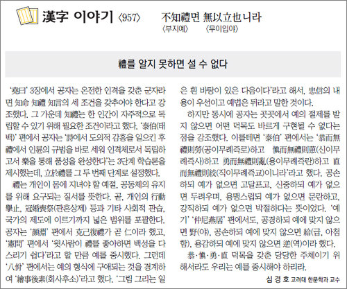 禮는 개인이 몸에 지녀야 할 예절, 공동체의 유지를 위해 요구되는 질서를 뜻한다. 곧, 개인의 行動擧止, 冠婚喪祭(관혼상제) 등과 기타 사회적 관습, 국가의 제도에 이르기까지 넓은 범위를 포괄한다. 공자는 ‘顔淵’ 편에서 克己復禮가 곧 仁이라 했고, ‘憲問’ 편에서 ‘윗사람이 禮를 좋아하면 백성을 다스리기 쉽다’라고 할 만큼 예를 중시했다. 그런데 ‘八佾’ 편에서는 예의 형식에 구애되는 것을 경계하여 ‘繪事後素(회사후소)’라고 했다. ‘그림 그리는 일은 흰 바탕이 있은 다음이다’라고 해서, 忠信의 내용이 우선이고 예법은 뒤라고 말한 것이다.