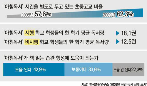 아침독서가 독서 습관 형성은 물론이고 학습에도 도움이 된다는 조사 결과가 나오면서 운동은 더욱 탄력을 받았다. 대구시는 시교육청 차원에서 아침독서를 적극 진행했는데 2007년 조사에서 대구시 학생들의 독서량이 전국 평균의 1.4∼2.2배인 것으로 나타났다. 한국출판연구소의 2009년 조사에선 아침독서 시행 학교 학생들의 한 학기 평균 독서량은 18.1권으로 비(非)시행 학교 학생들의 독서량(12.5권)보다 많았다. 2008년 일본 문부과학성의 전국 학력조사에선 아침독서를 실시한 학교가 그렇지 않은 학교보다 평균정답률에서 3%포인트(국어), 2.6%포인트(수학) 높은 것으로 나타났다.