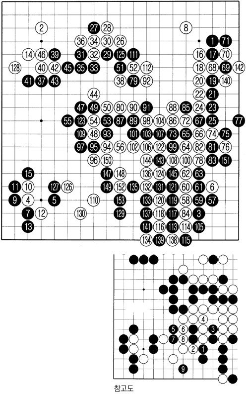 흑 153 때 백이 돌을 던졌다. 참고도는 흑이 백 대마를 잡는 수순을 보여 준다. 필연적 수순이어서 변화도 없다.