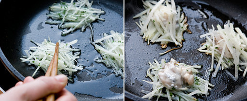 4 굴 위에 다시 감자를 올려 앞뒤로 노릇노릇하게 지진다.