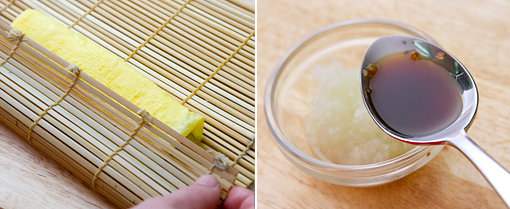 3 달걀말이를 김발에 싸서 그릇 등으로 살짝 눌러 모양을 잡은 후 먹기 좋은 크기로 썰어 담는다. 4 간 무 1/3컵에 간장 2를 섞은 후 달걀말이에 올려 먹는다.