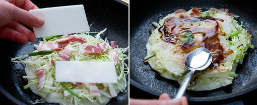 5 밀가루 반죽 위에 양배추, 베이컨, 떡, 쪽파, 달걀, 양배추 순으로 올린 다음 은근한 불로 부치다가 재료가 다 익기 전에 밀가루 반죽을 한 번 더 얇게 펴 덮는다. 6 ⑤를 잘 뒤집어 오코노미야키 소스를 바르고 마요네즈 1을 뿌린 후 가다랑어포 2와 파슬리가루 0.5를 뿌린다.