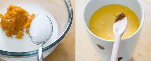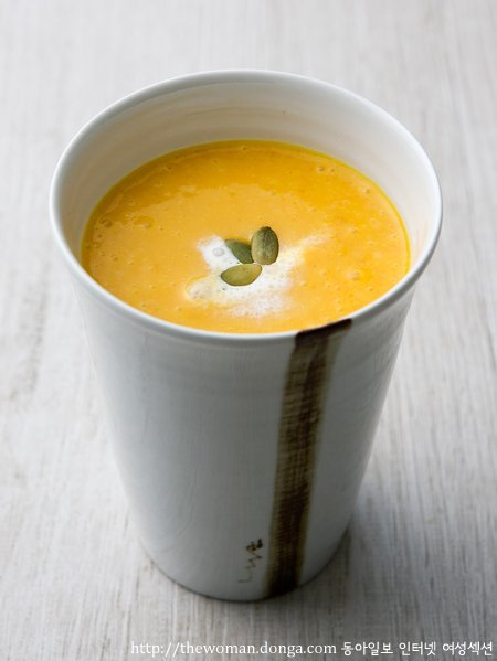 1 믹서에 찐 단호박 1/2컵, 우유 200ml, 설탕 1을 넣고 곱게 갈아 냄비에 붓고 따끈하게 데운다.