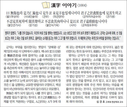 군자는 부엌을 멀리한다는 옛말이 ‘양혜왕·상’ 제7장의 바로 이 단락에서 나왔다. 제나라 宣王(선왕)은 흔鍾(흔종)을 위해 끌려가는 소를 보고는 양으로 대신하게 했는데 백성은 왕이 소를 아까워한다고 여겨 비난했다. 제선왕은 짐승이 死地(사지)로 나아감을 측은하게 여겨 그랬지만 소는 놓아주고 양을 대신하게 한 것은 어째서인지 모르겠으므로 백성의 비난도 당연하다고 말했다. 그러자 맹자는 눈에 보이는 소를 놓아주고 눈에 보이지 않는 양으로 대신하게 한 것은 仁을 실행하는 교묘한 방법이라 규정하고, 백성들이 비난하더라도 해가 되지 않으리라고 위로했다.
