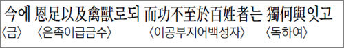 恩은 흔종에 끌려가는 소를 불쌍히 여겨 살려주었듯이 짐승에게 베푼 은혜를 말한다. 功은 功效이니, 정치에서 구체적으로 드러나는 효과를 뜻한다. 及은 ‘…에 미치다’, 不至於는 ‘…에 이르지 않다’이다. 不及이라고 해도 되지만 不至於라고 해서 글자의 중복을 피했다고 볼 수 있다. 獨何與는 ‘유독 어째서인가’라고 힐문하는 어조를 띤다. 與는 추정과 의문의 뜻을 지니는 종결사이다.