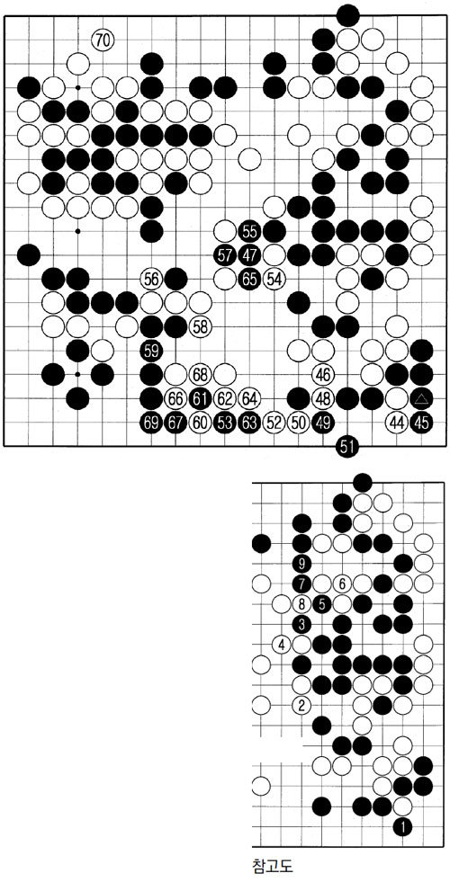 전보 마지막 수인 흑 ○를 참고도 흑 1로 뒀을 때의 변화를 하나만 더 알아보자. 백 2로 늘면 흑 3 이하의 매우 쉬운 수순으로 패를 낸다. 흑은 자체 팻감이 많다. 백 역시 패에 지면 6점이 잡힌다. 흑 대마가 걸린 패지만 백의 부담도 커서 백이 채택할 수 없는 그림이다.