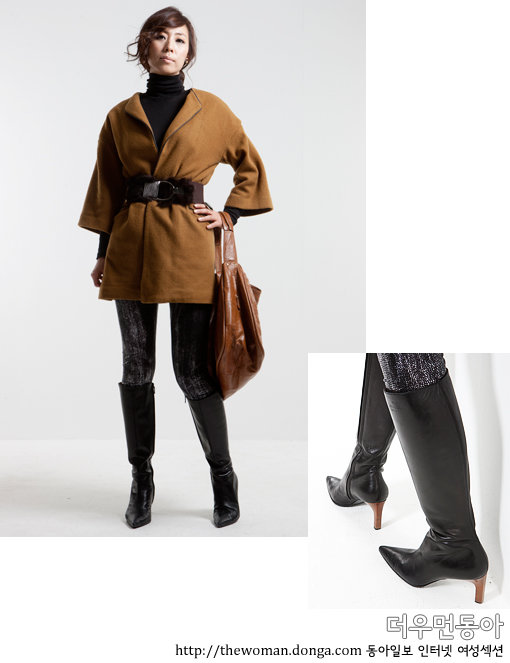 올 시즌 가장 트렌디한 컬러로 꼽히는 캐멀 컬러 하프 코트. 빅벨트로 허리를 강조해 슬림하게 연출했다. 블랙 풀오버와 스키니 팬츠와 함께 디테일을 생략한 블랙 롱부츠를 신어 시크한 이미지를 강조했다.