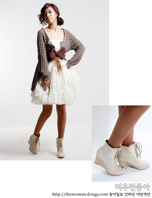 스커트를 슬리브리스 원피스로 연출한 후 굵은 짜임의 니트 카디건을 겹쳐 입고 리본 디테일의 빅 벨트로 허리를 강조해 여성스러운 느낌을 강조했다. 끈으로 묶는 타입의 레이스업 워커가 걸리시한 분위기를 더한다.