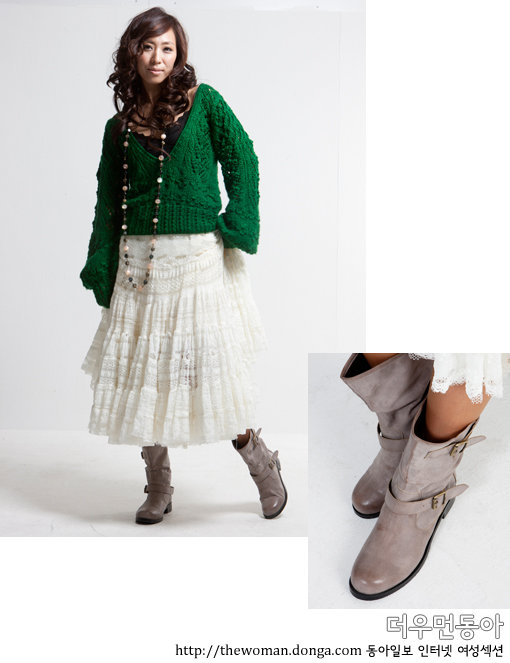 루스한 타입의 그린 컬러 니트와 레이스 디테일의 슬리브리스를 레이어드하고 롱스커트를 매치한 후 종아리까지 올라오는 라이딩 부츠를 신어 사랑스러운 보헤미안 룩을 완성했다.