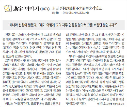 제나라 선왕은 자신이 등용했지만 도망한 신하들은 모두 본래 재주 없는 자들인데 당초 그 사실을 모르고 등용했던 것이라고 여겨 그들이 떠난 것을 개의치 않았다. 그래서 ‘어떻게 하면 미리 그가 재주가 있는지 없는지 알아서 재주 없는 자를 버린단 말인가?’라고 질문한 것이다. 제나라 선왕은 用人의 어려움을 實吐(실토)한 것이다. 종래 널리 읽힌 ‘명심보감’에 ‘疑人莫用(의인막용) 用人勿疑(용인물의)’라는 말이 있다. ‘재능이 의심스러운 사람은 아예 쓰지를 말고, 일단 사람을 썼으면 의심하지 말라’는 말이다. 用人의 문제와 관련해서 되새겨볼 만한 警句(경구)라고 생각한다.