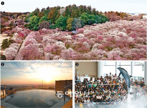 위치한 온천탕에서 바라본 간토 평야의 웅장한 모습. ③오아라이 수족관의 자랑인 돌고래 쇼는 가족 단위 관광객들에게 인기 만점이다. 사진 제공 이바라키 현청