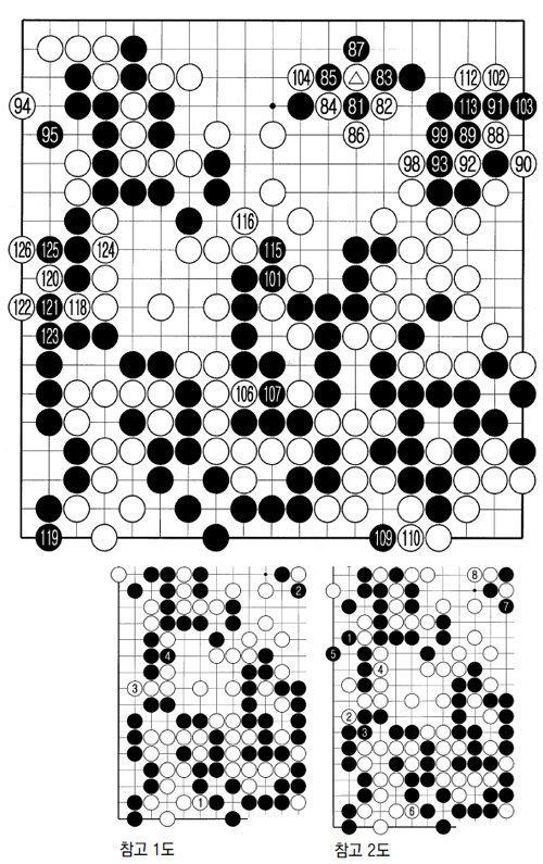 허 7단은 참고 1도를 기대하고 있다. 백이 좌하 대마가 죽을까봐 겁을 먹고 백 1로 받아주면 흑 2로 패를 해소할 참이다. 백 3으로 뚫려도 흑 4로 정비하면 백을 따라잡을 수 있다는 판단이다. 김 7단도 흑 119에 함정이 숨겨져 있다는 걸 느낀다. 상대가 유도한 길은 넓고 평탄해 보이지만 패망으로 이어질 수 있다.