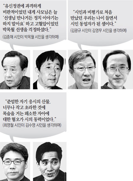 김광규 시인은 자신의 첫 시선집의 해설을 써준 김영무 시인을 떠올리며 시 ‘똑바로 걸어간 사람’을 썼다. 최영철 시인은 김수영 시인의 시를 곱씹으며 ‘통렬한 자기 응시’를 배웠고, 이를 통해 시 ‘오체투지’를 펼쳐냈다고 털어놨다.
